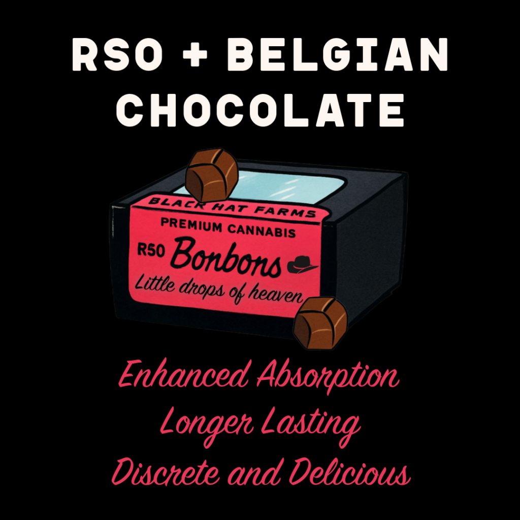 - Precise Dosing: RSO typically comes in measured syringes for tiny, controlled doses. It can also be found in edibles, like Black Hat Farms RSO chocolates, which use dark chocolate to beautifully mask RSO’s deep, earthy aroma.