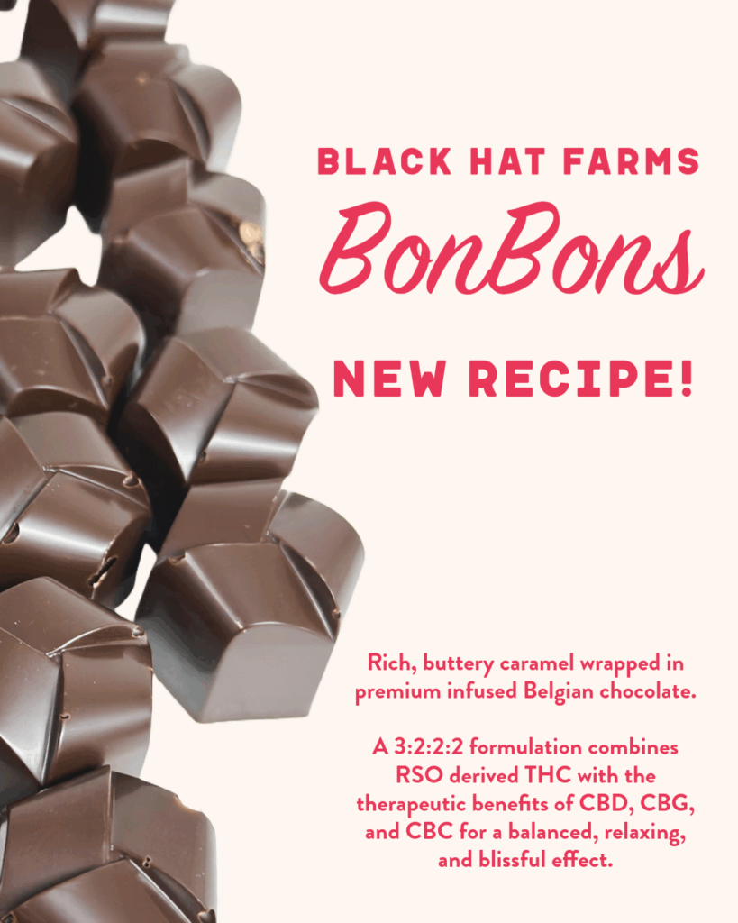 Just starting out? Try our house made Bonbons made with full spectrum RSO oil. Delicious little dark chocolate bites of goodness surrounding rich, buttery caramel. One heavenly bite later, your troubles melt away, thanks to the contributions of the minor cannabinoids.